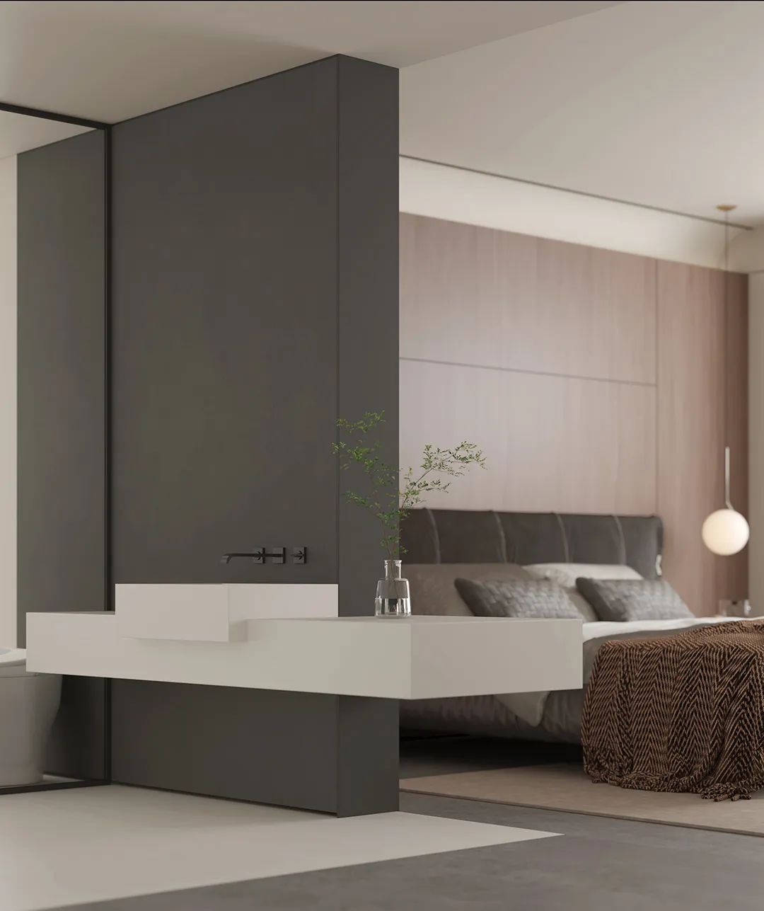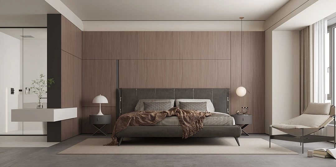 The background of the bed head is paved with ebony oak sintered stone.