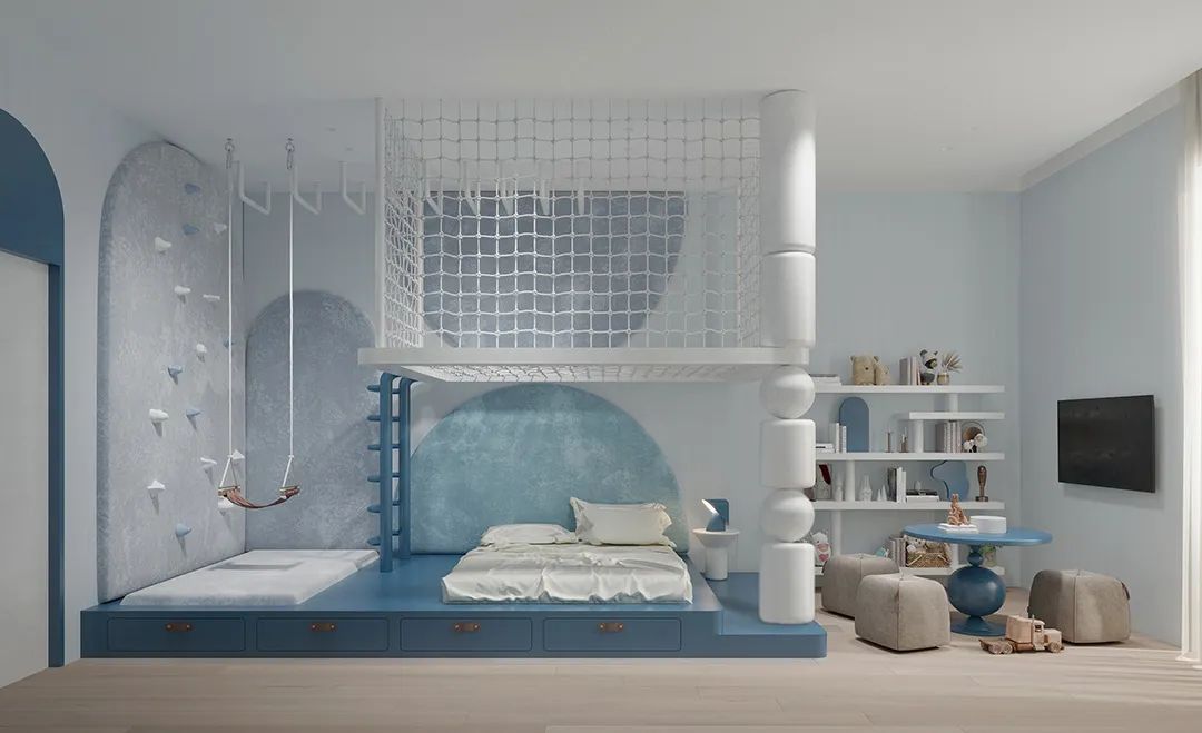 Children's room walls are tiled with thin blue porcelain slabs