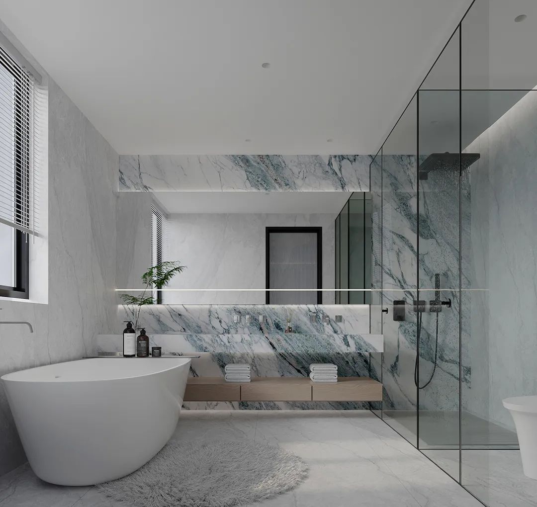 The bathroom is paved with a large area of sintered stone in green color.