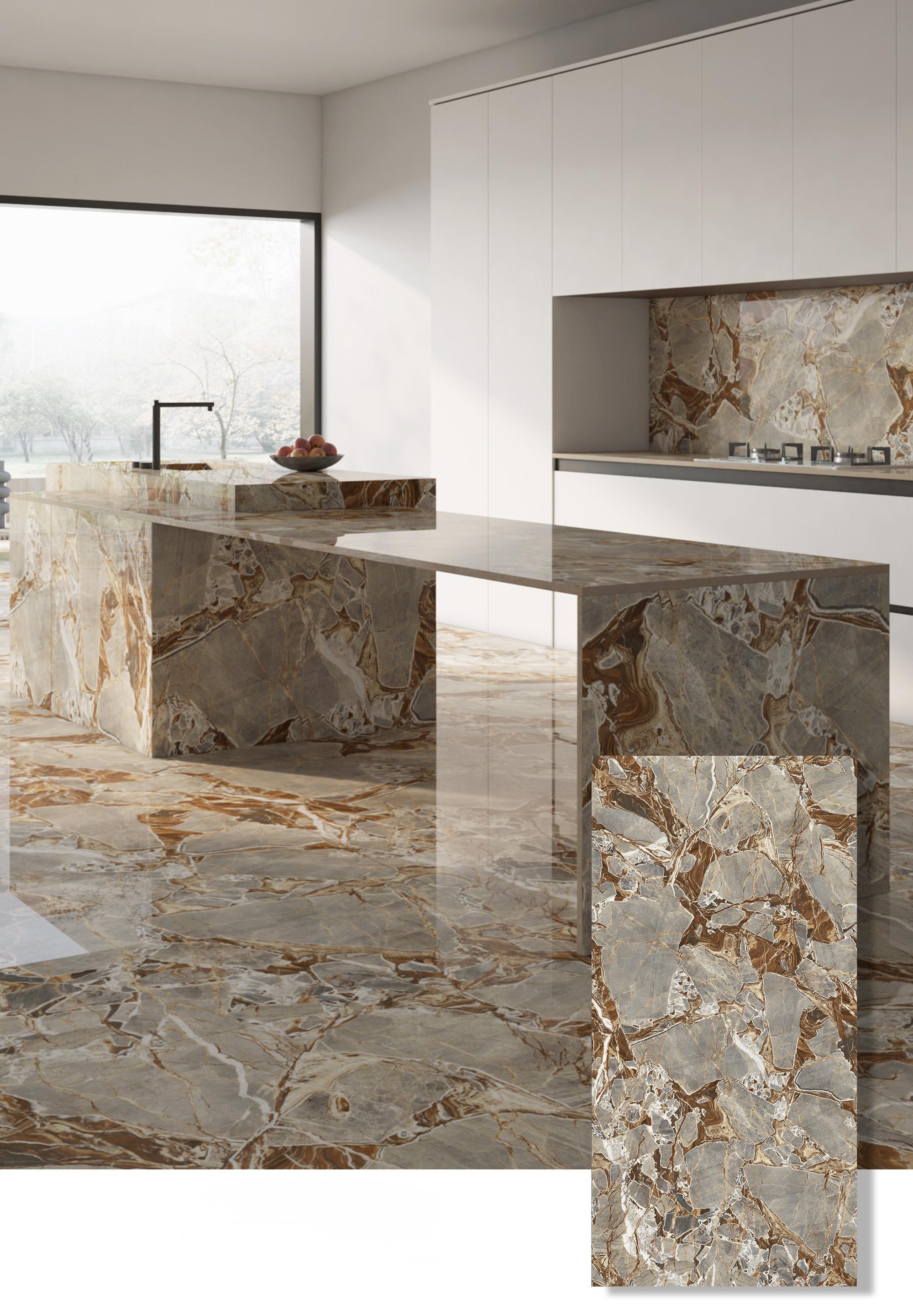 A finish that highlights the chromatic hues and nuances of porcelain stoneware, bringing out the beauty of the pattern and giving it a refined look. Precision mechanical processing polishes the surface to a perfectly uniform finish, allowing it to reflect light.